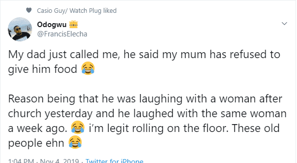 Reason being that he was laughing with a woman after church yesterday and he laughed with the same woman a week ago. I’m legit rolling on the floor. These old people ehn.’he tweeted.