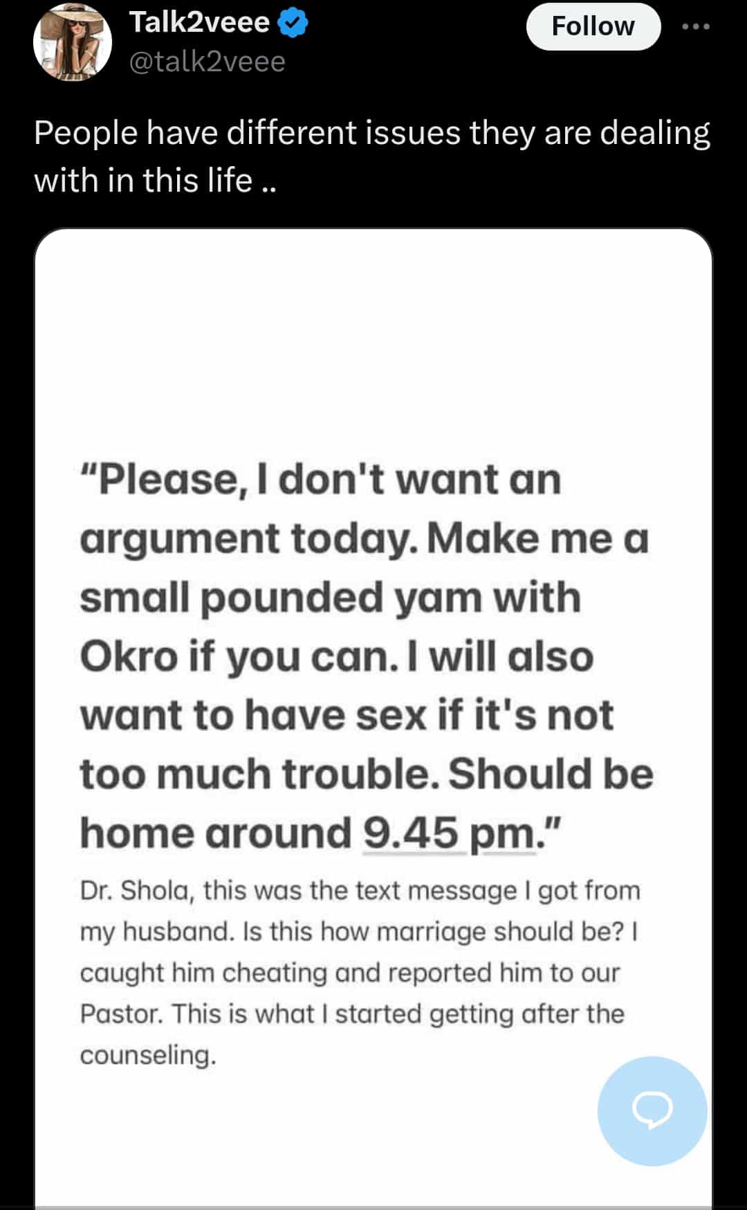 However, shortly after the counseling session, she began receiving disturbing messages from her husband. One such message read: “Please, I don’t want an argument today. Make me a small pounded yam with okra if you can. I would also like to have sex if it’s not too much trouble. Should be home around 9:45 pm.”