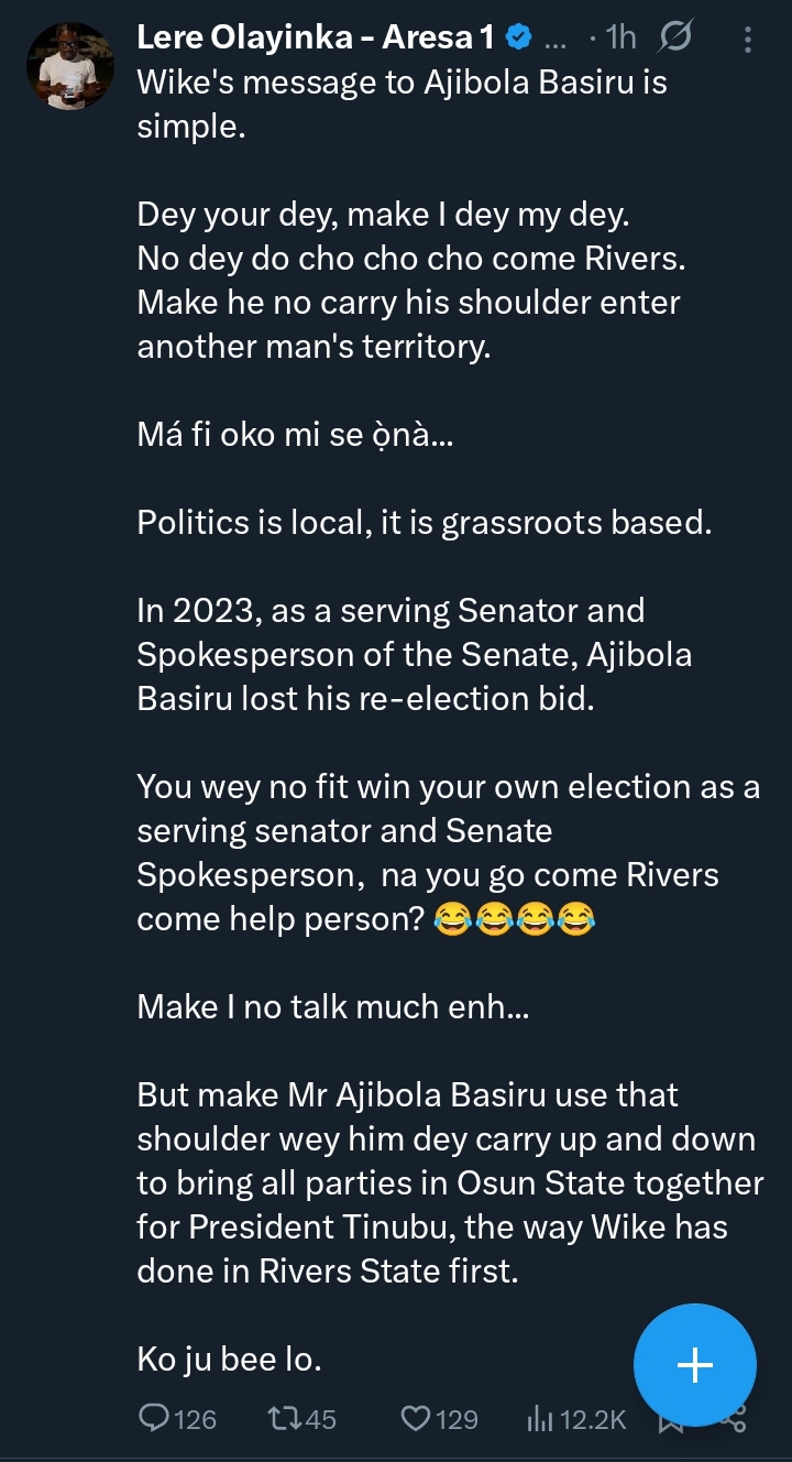 “You wey no fit win your own election as a serving senator and Senate Spokesperson, na you go come Rivers come help person? 😂😂😂😂,” Olayinka wrote, before urging Basiru to first unify fractured APC factions in Osun State for President Bola Tinubu, as Wike has allegedly done in Rivers.