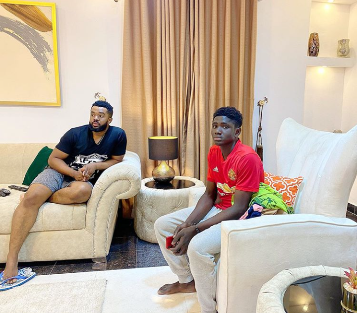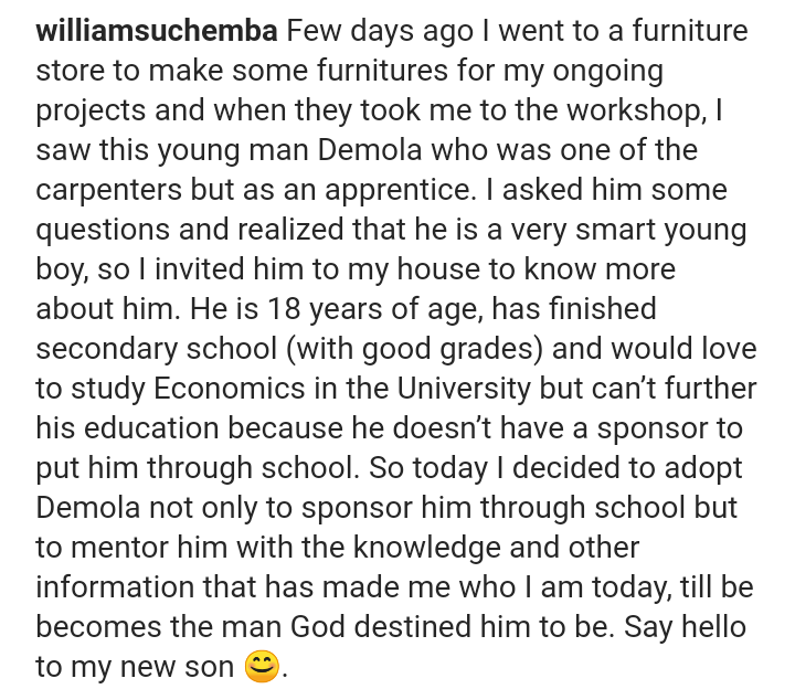 “Few days ago I went to a furniture store to make some furnitures for my ongoing projects and when they took me to the workshop, I saw this young man Demola who was one of the carpenters but as an apprentice. I asked him some questions and realized that he is a very smart young boy, so I invited him to my house to know more about him. He is 18 years of age, has finished secondary school (with good grades) and would love to study Economics in the University but can’t further his education because he doesn’t have a sponsor to put him through school. So today I decided to adopt Demola not only to sponsor him through school but to mentor him with the knowledge and other information that has made me who I am today, till be becomes the man God destined him to be. Say hello to my new son ?.”
