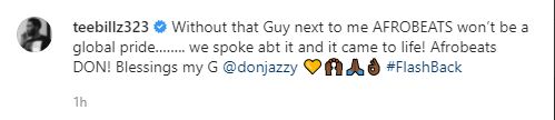 Sharing a throwback photo with the music producer, Teebillz stated that without Don Jazzy‘s effort, Afrobeats would not have been celebrated worldwide.