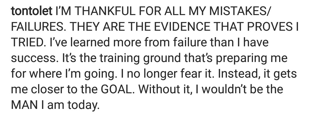 “I’M THANKFUL FOR ALL MY MISTAKES/FAILURES. THEY ARE THE EVIDENCE THAT PROVES I TRIED. I’ve learned more from failure than I have success. It’s the training ground that’s preparing me for where I’m going. I no longer fear it. Instead, it gets me closer to the GOAL. Without it, I wouldn’t be the MAN I am today.”