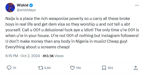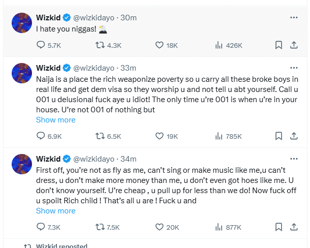 Wizkid continues to roast Davido, calls him cheap and other unprintable names