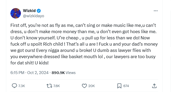 “First off, you’re not as fly as me, can’t sing or make music like me,u can’t dress, u don’t make more money than me, u don’t even got hoes like me. U don’t know yourself. U’re cheap , u pull up for less than we do! Now fuck off u spoilt Rich child ! That’s all u are ! Fuck u and your dad’s money we got ours! Every nigga around u broke! U dumb ass lawyer flies with you everywhere dressed like basket mouth lol , our lawyers are too busy for dat shit! U kids!