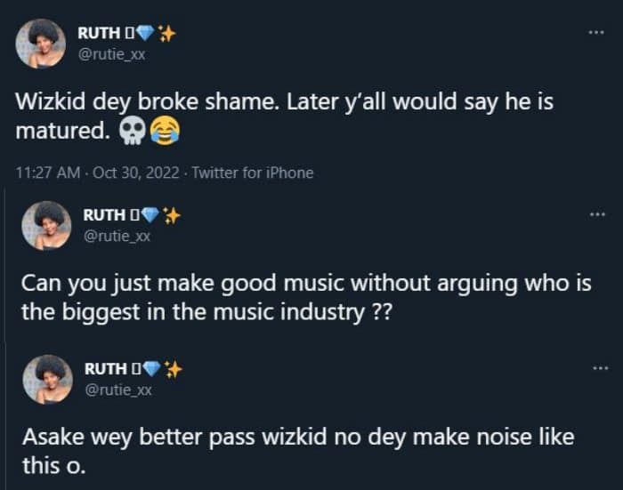 “Wizkid dey broke shame. Later y’all would say he is matured. 💀😂. Can you just make good music without arguing who is the biggest in the music industry ?? Asake wey better pass wizkid no dey make noise like this o,” she wrote.
