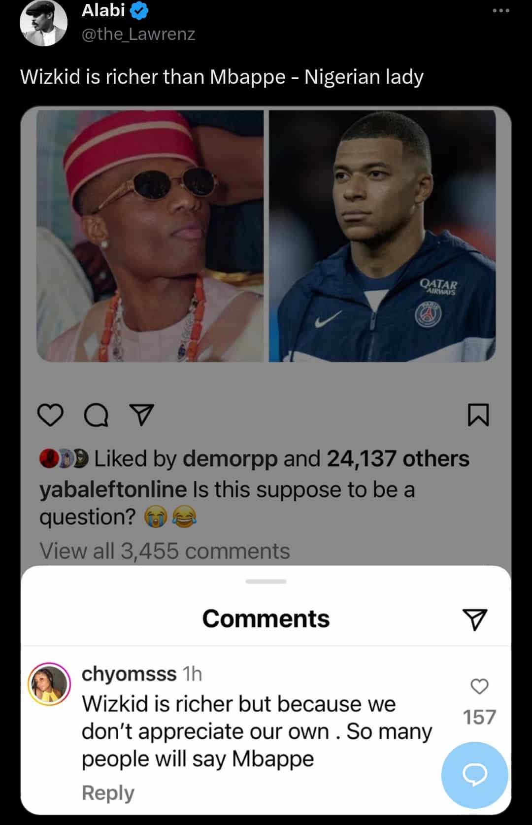In a public post shared by a social media user, the lady wrote: “Wizkid is richer, but because we don’t appreciate our own, many people will say Mbappé.”