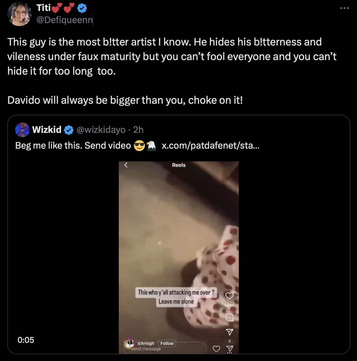 Defiqueenn wrote: “This guy is the most b!tter artist I know. He hides his b!tterness and vileness under faux maturity but you can’t fool everyone and you can’t hide it for too long too. Davido will always be bigger than you, choke on it!”