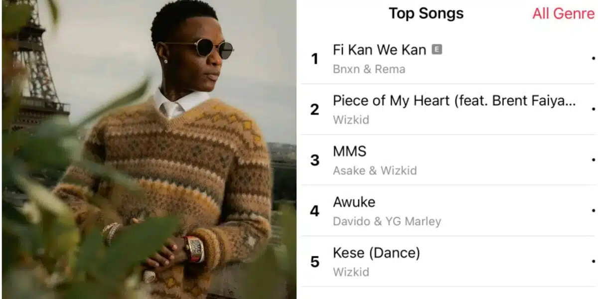 Afrobeats sensation, Wizkid dominates chart rankings with his new single ‘Dance’, securing a spot in the top 5 on Apple Music Charts.