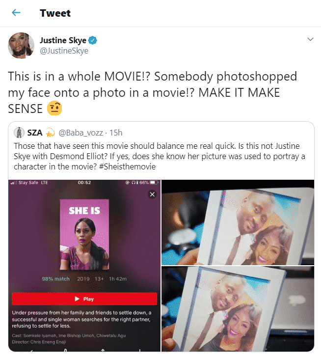 A Twitter who saw the movie titled ‘She Is’, shared a screenshot of the photo of Justine with actor Desmond Elliot. Justine then reacted saying;