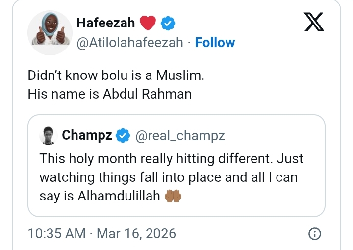 During the online conversation, a user on X asked Boluwatife to reveal his Arabic or Muslim name.