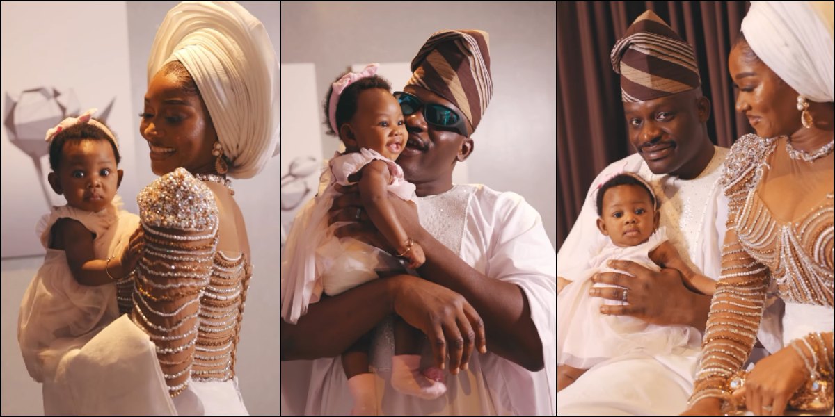 Wofai Fada and Taiwo Cole unveil their baby’s face as they celebrate her dedication