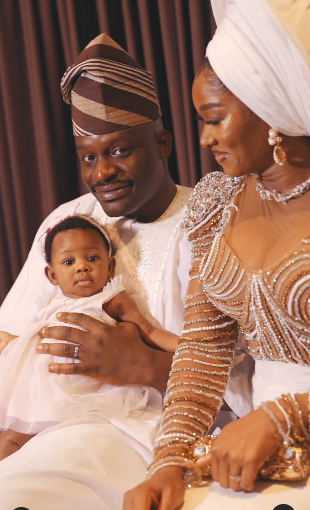 Popular actress and comedian, Wofai Fada and her husband, Taiwo Cole unveil their daughter’s face as they celebrate her dedication in church.