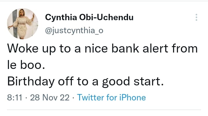 “Woke up to a nice bank alert from boo” – Ebuka Obi-Uchendu’s wife, Cynthia gushes as she marks birthday