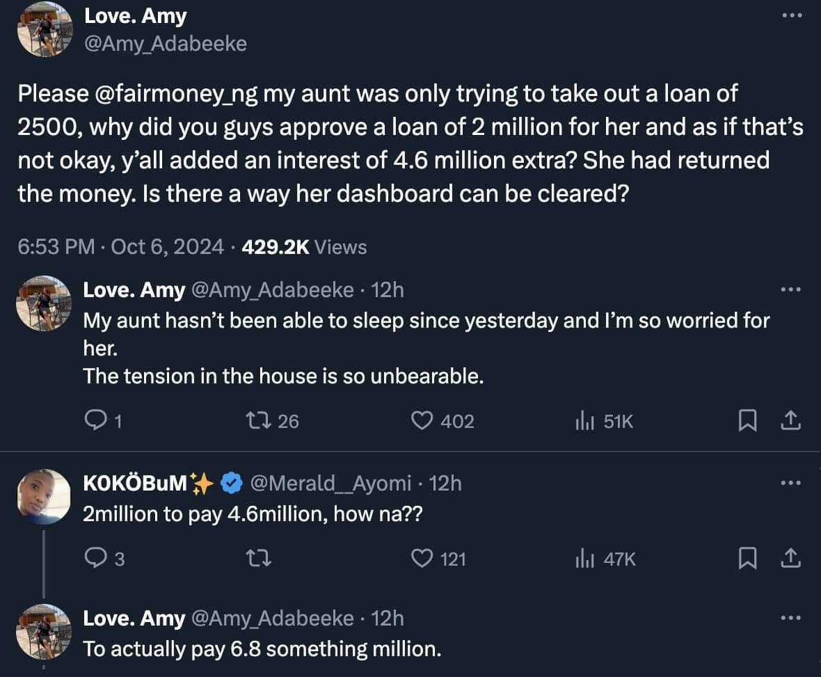 In the viral post shared via X (formerly Twitter), the user wrote, “Please @fairmoney_ng my aunt was only trying to take out a loan of ₦2,500, why did you guys approve a loan of ₦2 million for her? And as if that’s not okay, y’all added an interest of ₦4.6 million extra? She had returned the money. Is there a way her dashboard can be cleared? To actually pay ₦6.8 something million.”