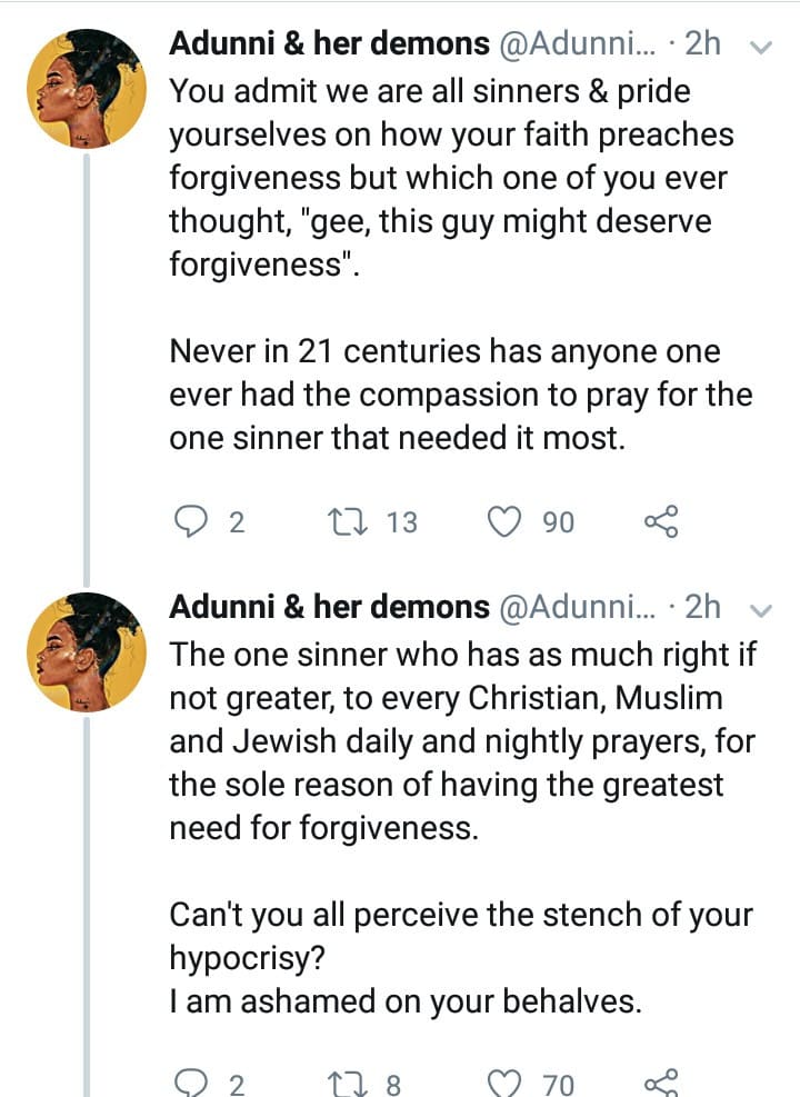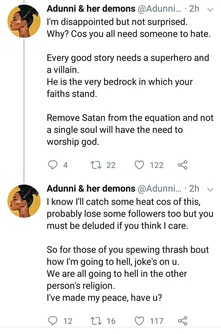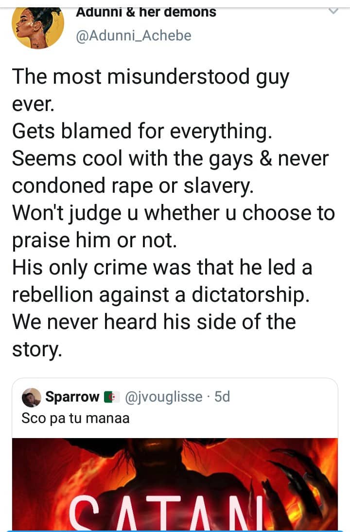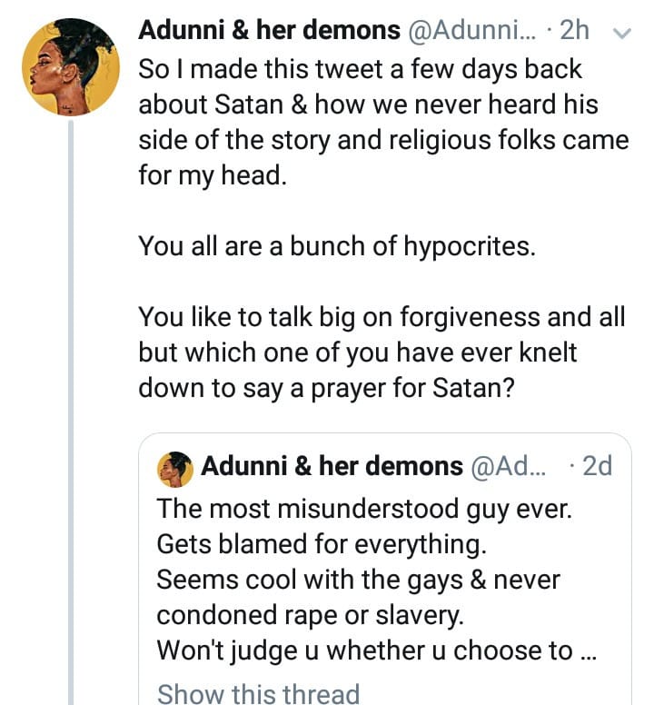 Days ago, @Adunni_Achebe tweeted that ”Satan is the most misunderstood guy” who “gets blamed for everything” and “we never heard his side of the story”. Her tweet was attacked by Christians and she was also attacked personally so she addressed that in a thread.