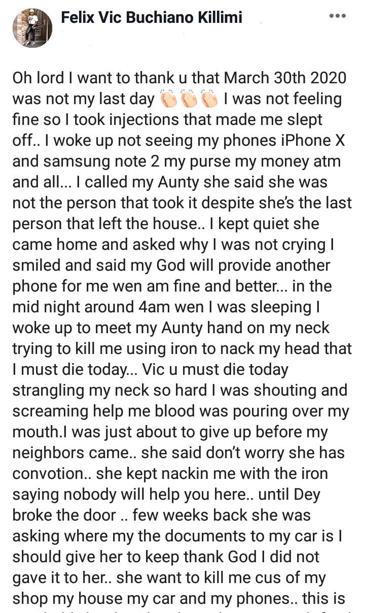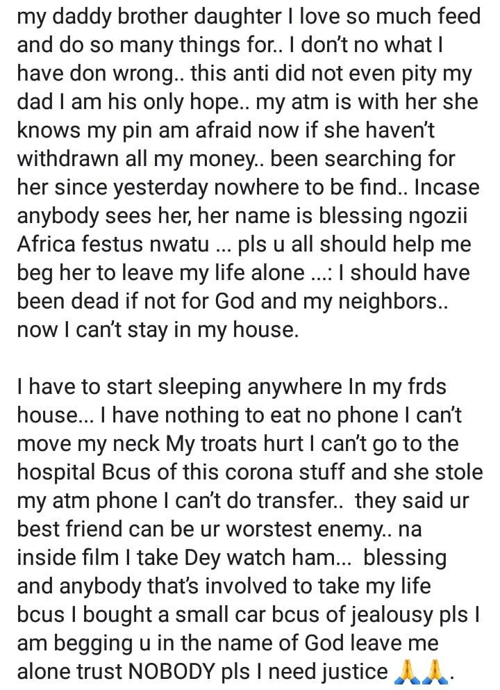 “Oh lord I want to thank u that March 30th 2020 was not my last day. I was not feeling fine so I took injections that made me slept off.. I woke up not seeing my phones iPhone X and samsung note 2 my purse my money atm and all… I called my Aunty she said she was not the person that took it despite she’s the last person that left the house.. I kept quiet she came home and asked why I was not crying I smiled and said my God will provide another phone for me wen am fine and better… in the mid night around 4am wen I was sleeping I woke up to meet my Aunty hand on my neck trying to kill me using iron to nack my head that I must die today… Vic u must die today strangling my neck so hard I was shouting and screaming help me blood was pouring over my mouth.I was just about to give up before my neighbors came.. she said don’t worry she has convotion.. she kept nackin me with the iron saying nobody will help you here.. until Dey broke the door .. few weeks back she was asking where my the documents to my car is I should give her to keep thank God I did not gave it to her.. she want to kill me cus of my shop my house my car and my phones.. this is my daddy brother daughter I love so much feed and do so many things for.. I don’t no what I have don wrong.. this anti did not even pity my dad I am his only hope.. my atm is with her she knows my pin am afraid now if she haven’t withdrawn all my money.. been searching for her since yesterday nowhere to be find.. Incase anybody sees her, her name is blessing ngozii Africa festus nwatu … pls u all should help me beg her to leave my life alone …: I should have been dead if not for God and my neighbors.. now I can’t stay in my house.