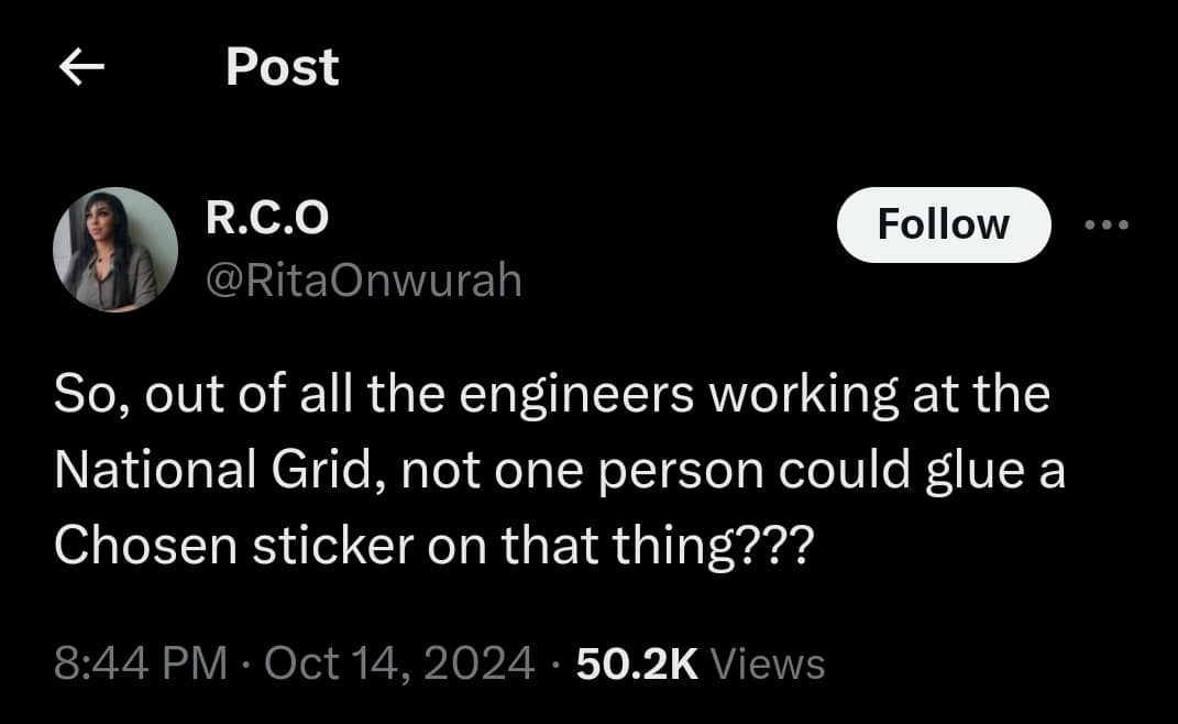 She wrote: “So, out of all the engineers working at the National Grid, not one person could glue a Chosen sticker on that thing???”