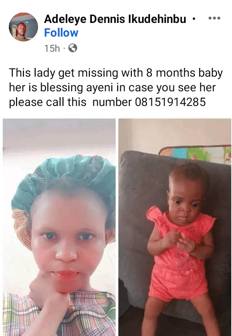 A 28-year-old woman, Mrs. Blessing Ayeni, and her 8-month-old baby have been reported missing after an alleged kidnapping incident.