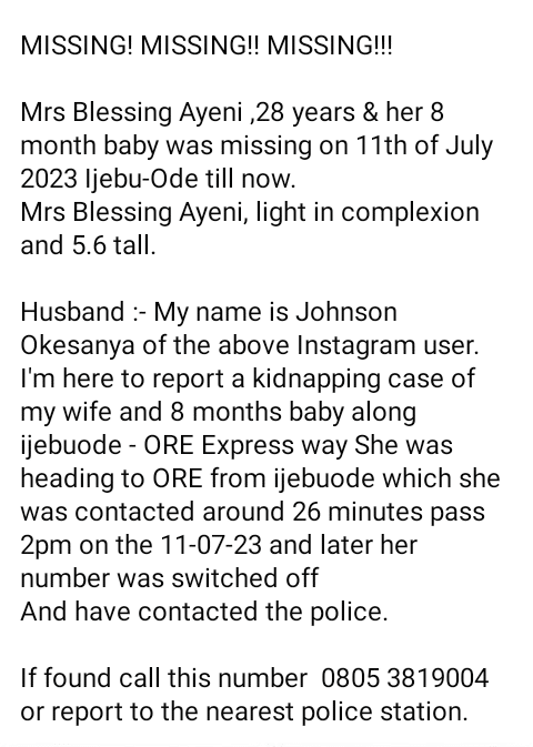 Husband :- My name is Johnson Okesanya of the above Instagram user. I’m here to report a kidnapping case of my wife and 8 months baby along ijebuode – ORE Express way She was heading to ORE from ijebuode which she was contacted around 26 minutes pass 2pm on the 11-07-23 and later her number was switched off And have contacted the police.
