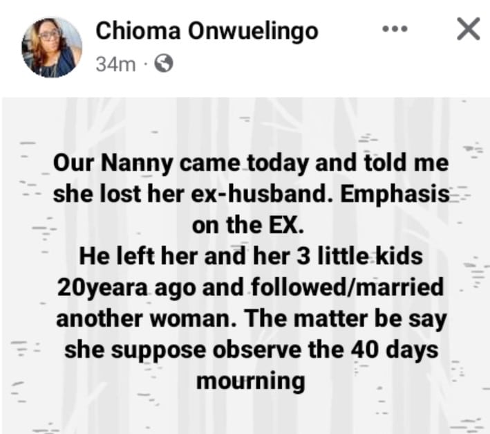 According to the lady who shared the story on Facebook, the lady who is her children’s nanny told her the ex-husband’s family has asked her to mourn him for 40 days after he passed on recently.