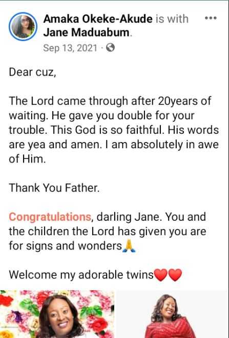 A woman identified as Jane Maduabum and her husband have welcomed a set of twins after 20 years of waiting.