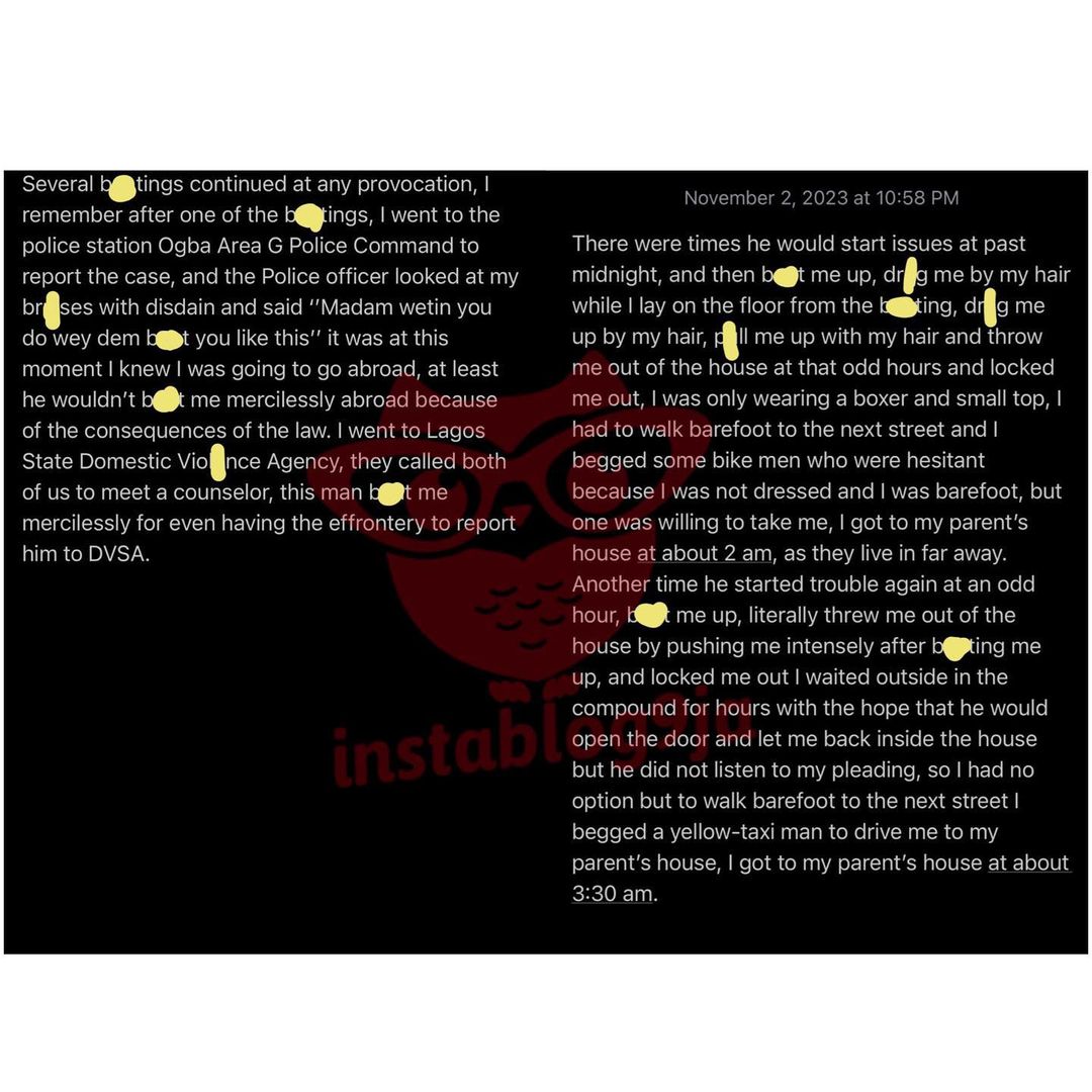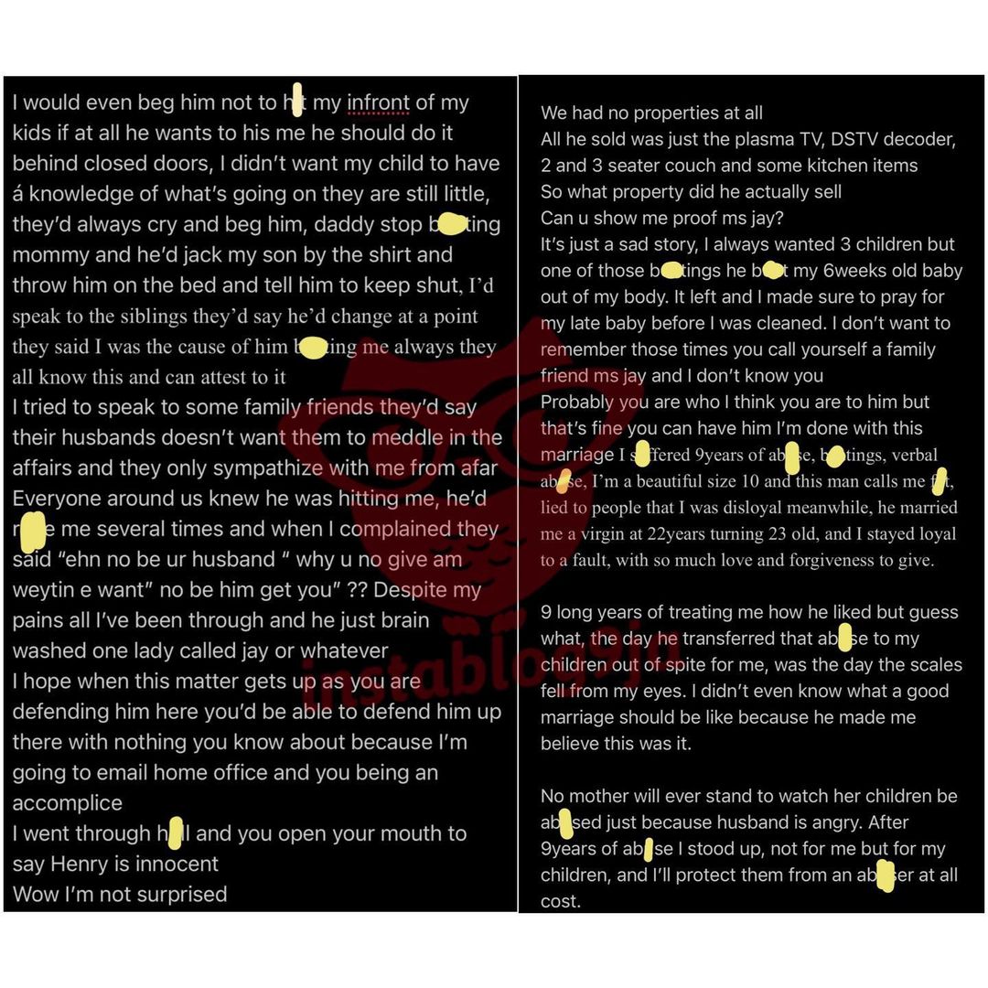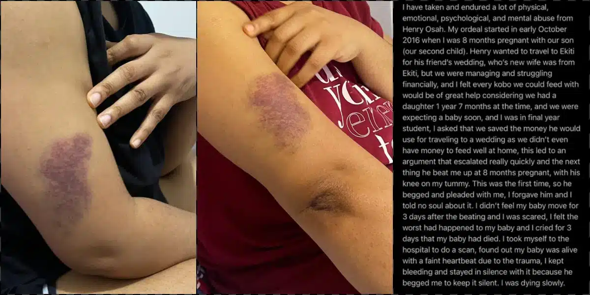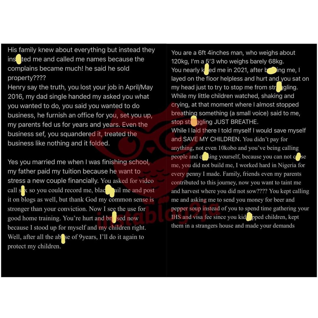“I have taken and endured a lot of physical, emotional, psychological, and mental abuse from Henry Osah. My ordeal started in early October 2016 when I was 8 months pregnant with our son (our second child).