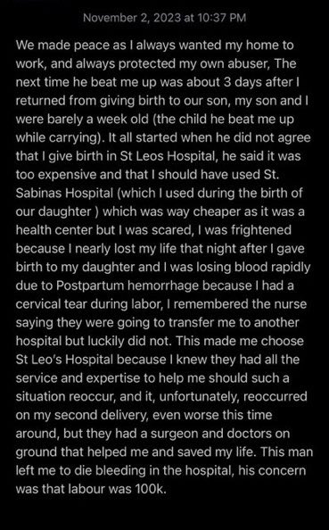 I didn’t feel my baby move for 3 days after the beating and I was scared, I felt the worst had happened to my baby and I cried for 3 days that my baby had died. I took myself to the hospital to do a scan, found out my baby was alive with a faint heartbeat due to the trauma, I kept bleeding and stayed in silence with it because he begged me to keep it silent. I was dying slowly.”