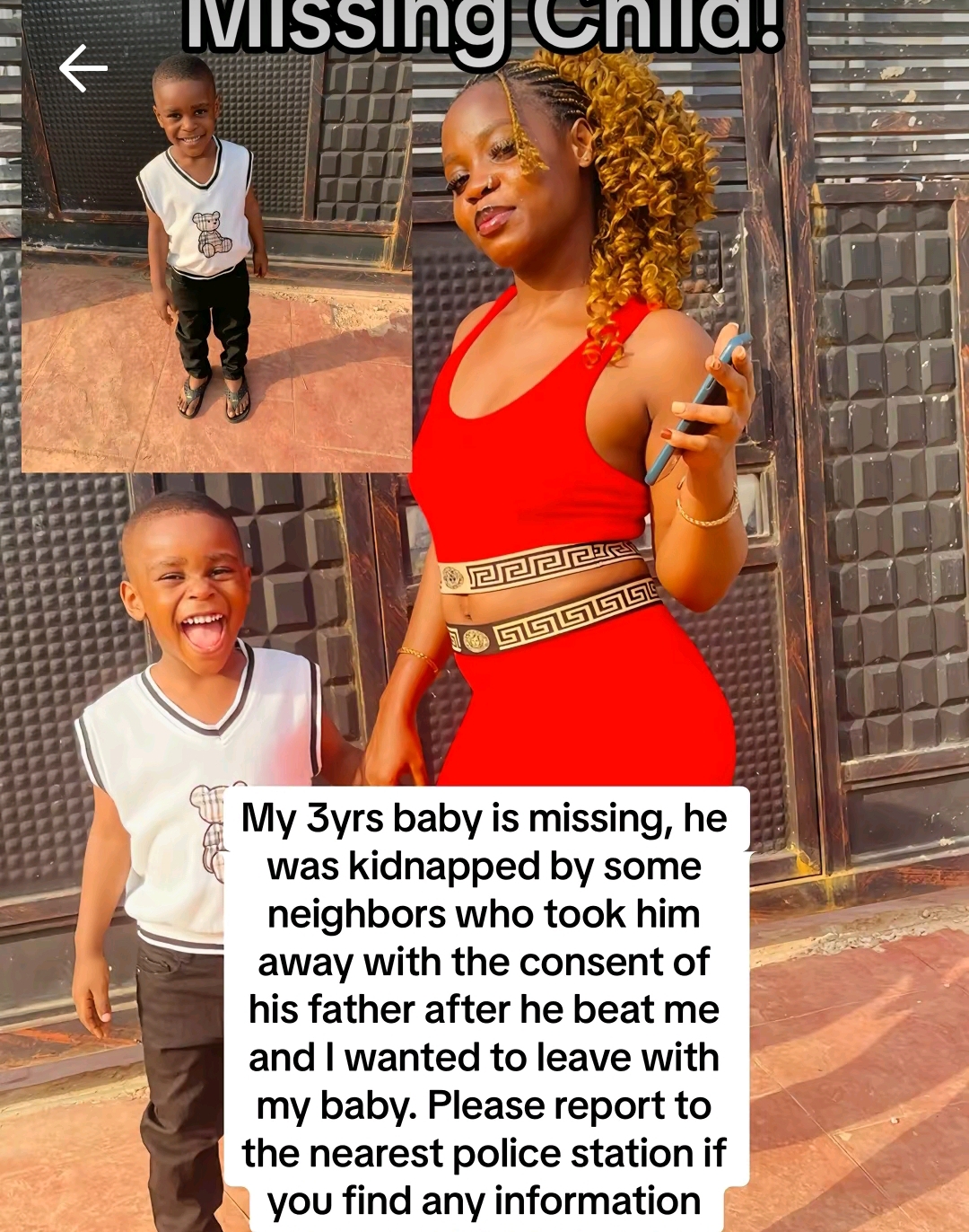 “My three-year-old baby is missing! Some neighbors took him away with his father’s approval after he beat me up when I tried to leave with my child.”