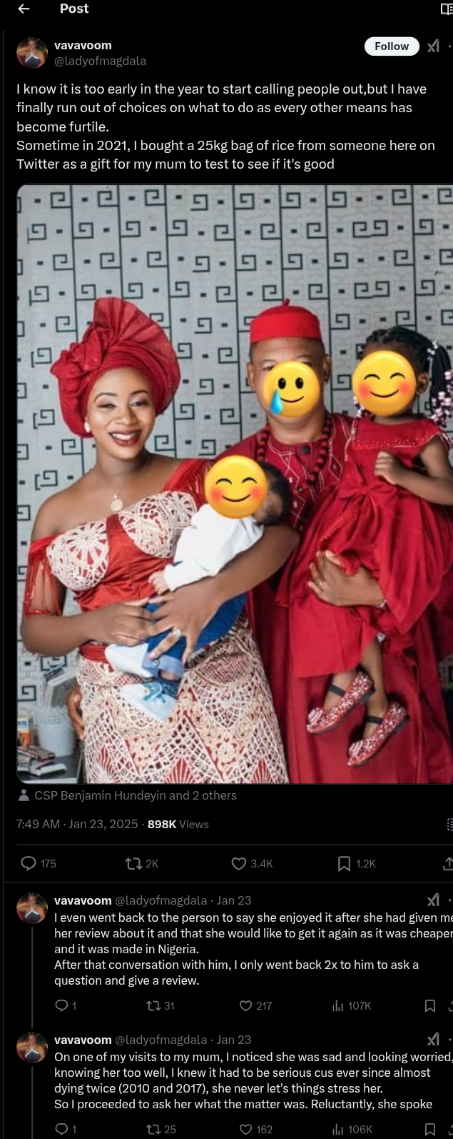 “I know it’s still early in the year to start calling people out, but I’ve run out of options, as every other attempt has proven futile. In 2021, I bought a 25kg bag of rice from a seller here on Twitter as a gift for my mother to try.”