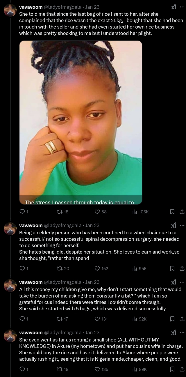 According to the post, her mother, who has been confined to a wheelchair due to a spinal surgery, began a rice business to ease the financial burden on her children.