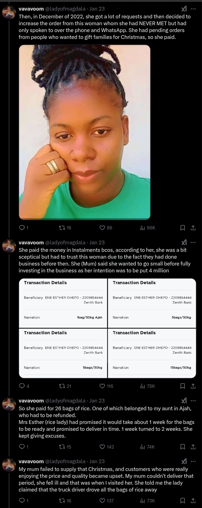 However, in December 2022, Esther convinced her to place a larger order of 26 bags of rice worth ₦4 million, promising delivery within a week.