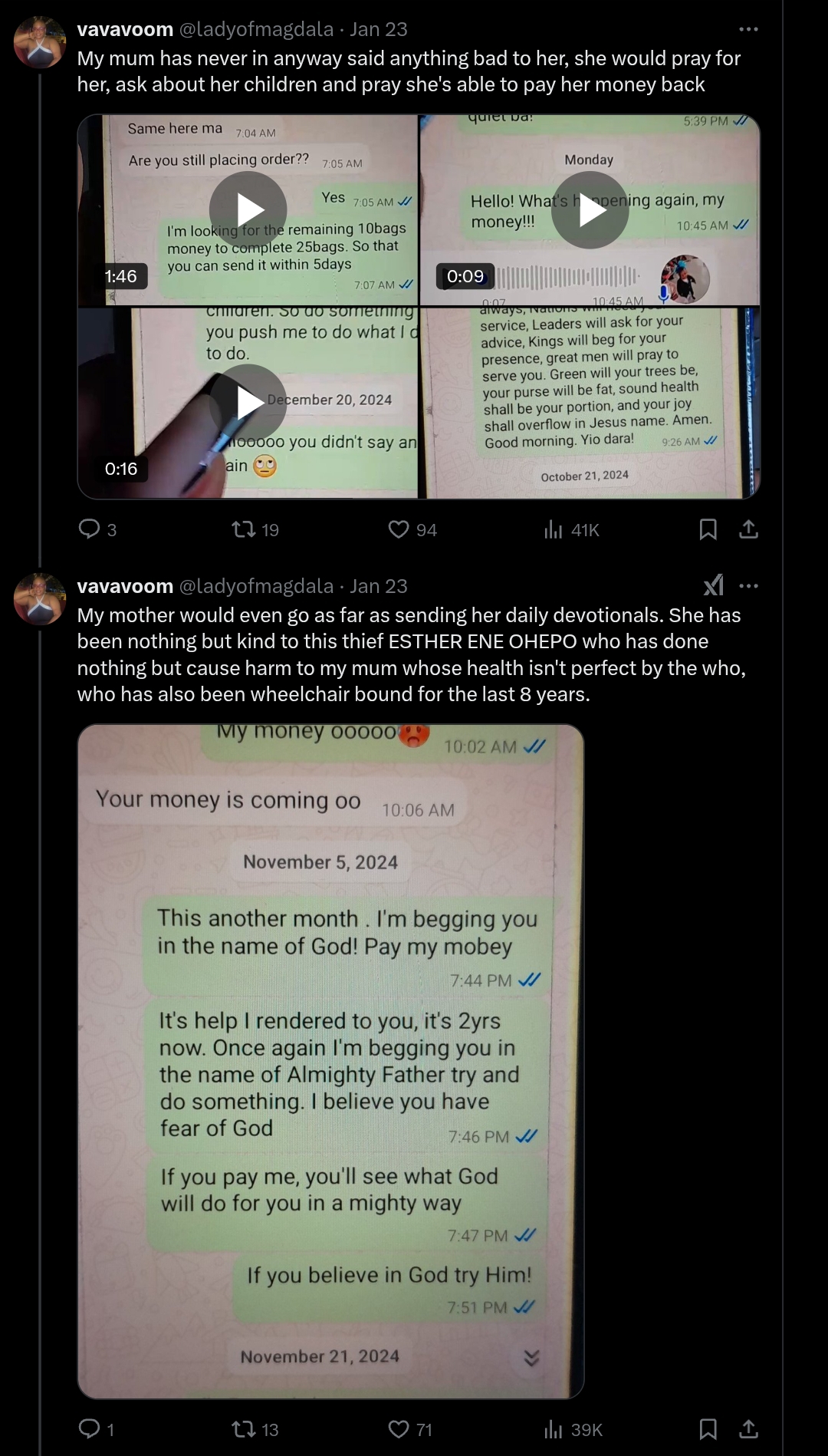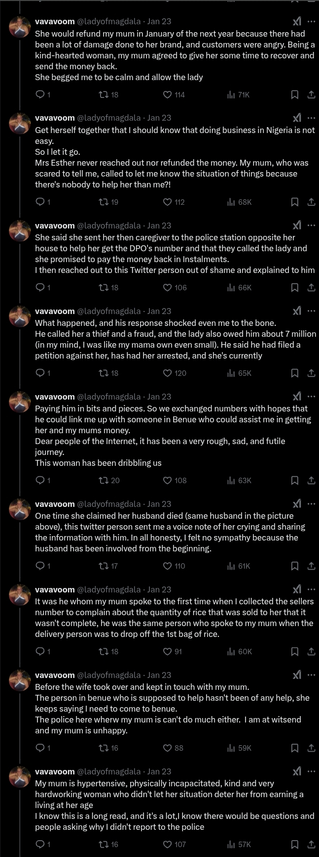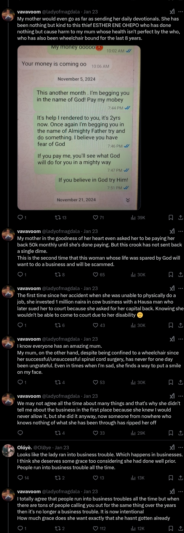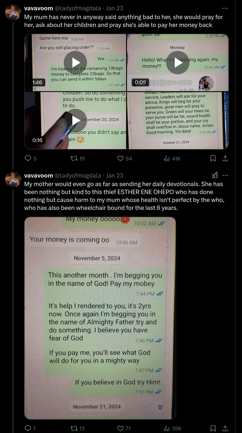 “My mom fell ill, and that’s when I visited her. She explained that Esther claimed the truck driver had driven off with all the bags. She promised to refund the money in January, but it never happened. My mom, being kind-hearted, agreed to give Esther more time to recover, understanding that doing business in Nigeria can be tough.”
