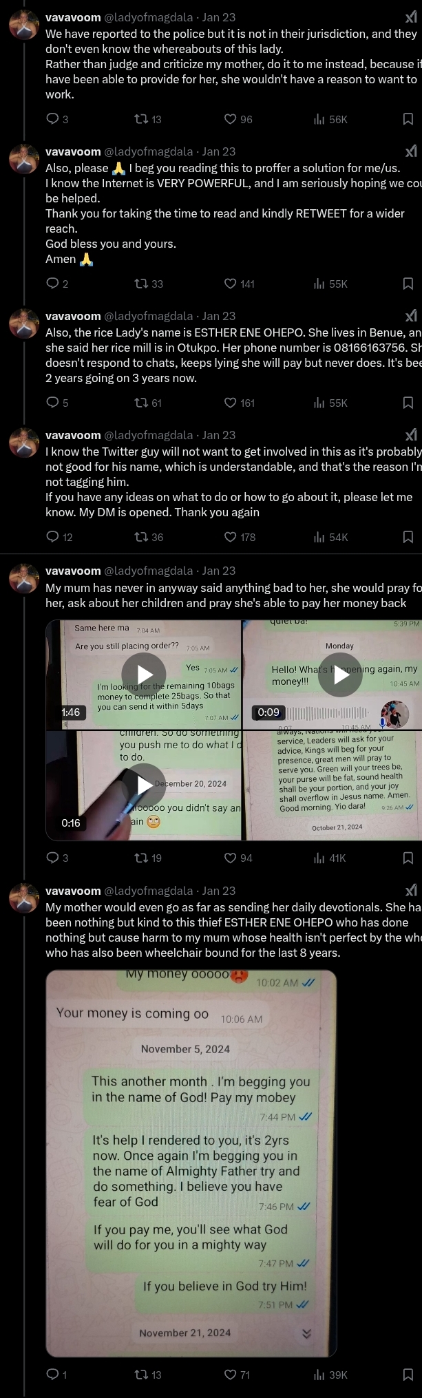 “Good day everyone, today marks the second day of my mission to call out a fraudulent woman named Esther Ene Ohepo, who disguises herself as a rice vendor at Otukpo Rice Mill, Benue. This may be a lengthy read, but I implore you to indulge me so that others may be saved from this deceit.”