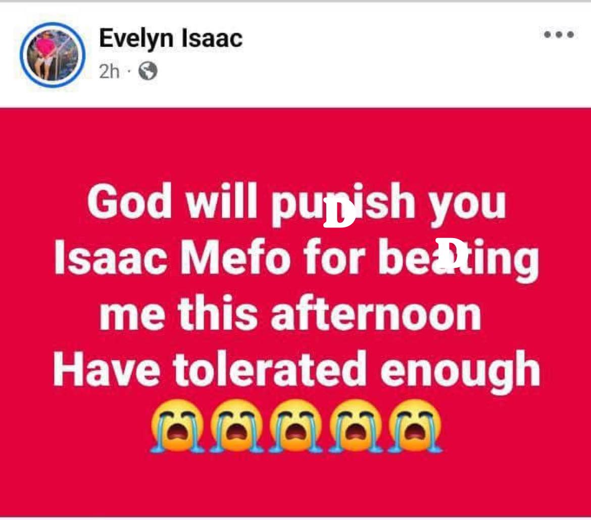 “God will punish you Isaac Mefo for beating me this afternoon. Have tolerated enough,” she wrote.
