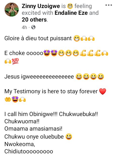 “Gloire à dieu tout puissant. E choke ooooo. Jesus igweeeeeeeeeeeeee. My Testimony is here to stay forever. I call him Obinigwe!!! Chukwuebuka!! Chukwuoma!! Omaama amasiamasi! Chukwu onye oluebube. Nwokeoma, Chidiutoooooo. Pls what do you call him,” she wrote.