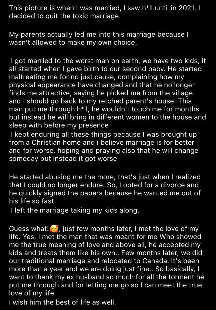 It’s been more than a year and we are doing just fine.. So basically, I want to thank my ex-husband so much for all the torment he put me through and for letting me go so I can meet the true love of my life. I wish him the best of life as well.”