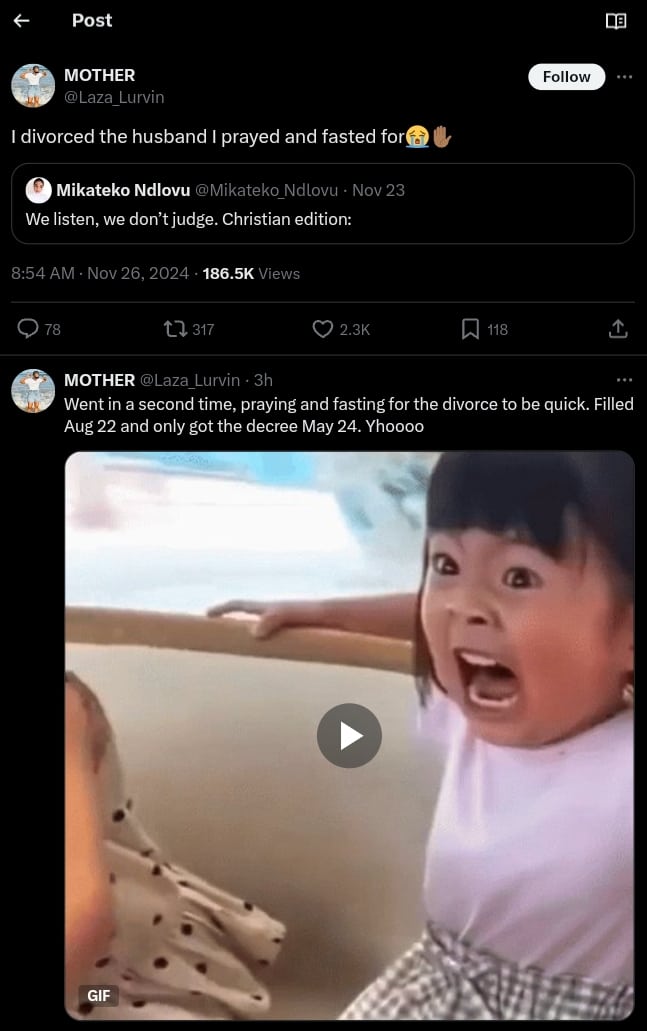 “I went in a second time, praying and fasting for the divorce to be finalized quickly. I filed on Aug 22 and only got the decree on May 24. Yhoooo,” she added.