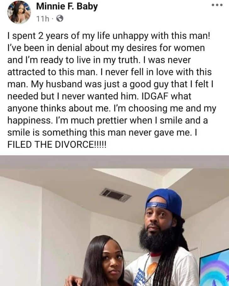 “I spent 2 years of my life unhappy with this man! I’ve been in denial about my desires for women and I’m ready to live in my truth. I was never attracted to this man. I never fell in love with this man.