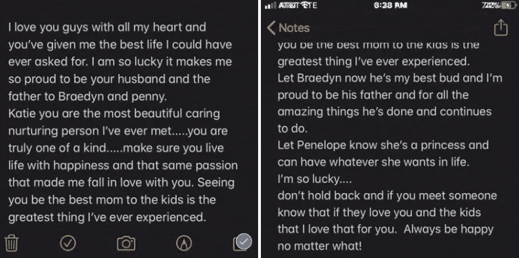 Among these items was his phone, which Katie went through and she found a note that Jon had written for her in the event of his death.