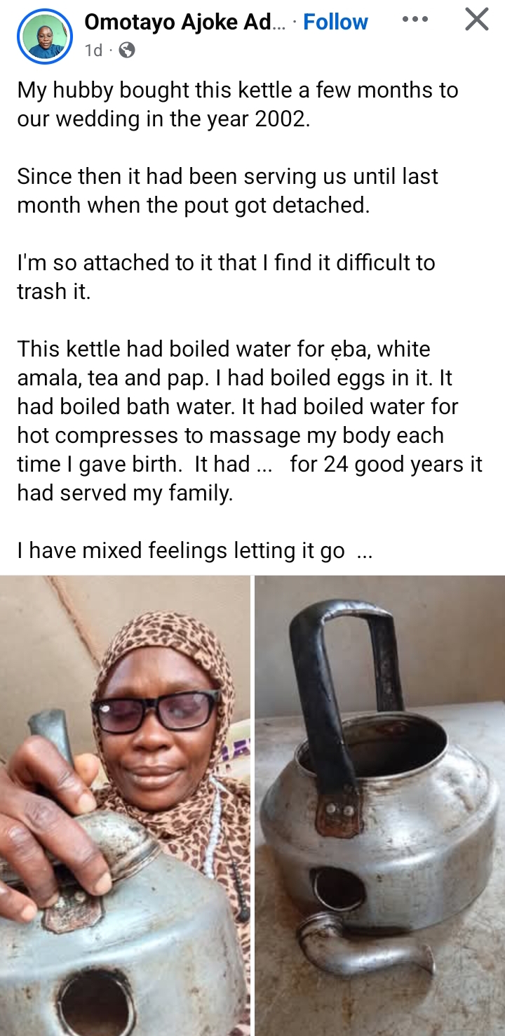 A Nigerian woman, Omotayo Ajoke Adetunji, has shared an emotional story about a household kettle that served her family for more than two decades.
