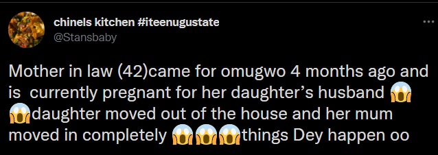 “Mother in law (42)came for omugwo 4 months ago and is currently pregnant for her daughter’s husband