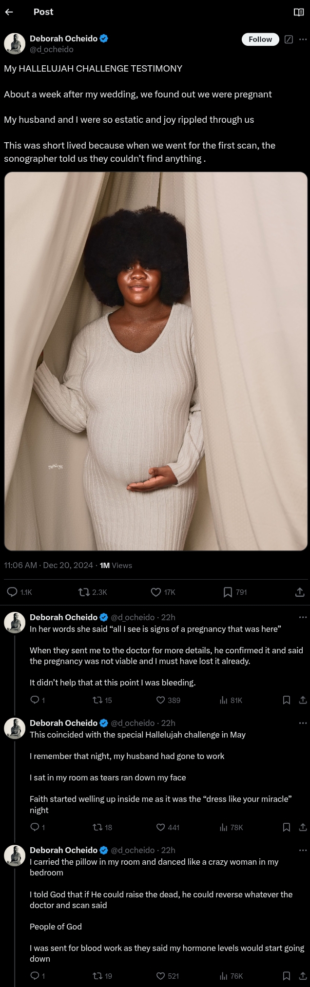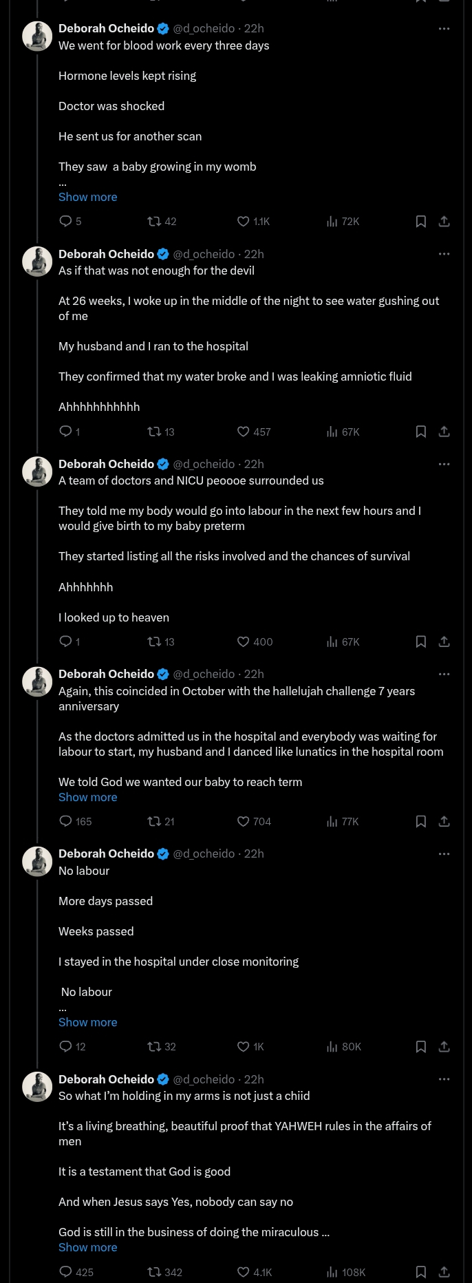 “So, what I’m holding in my arms is not just a child; it’s a living, breathing, beautiful proof that Yahweh rules in the affairs of men. It is a testament that God is good, and when Jesus says yes, nobody can say no. God is still in the business of doing the miraculous. Your own testimony is on the way.”