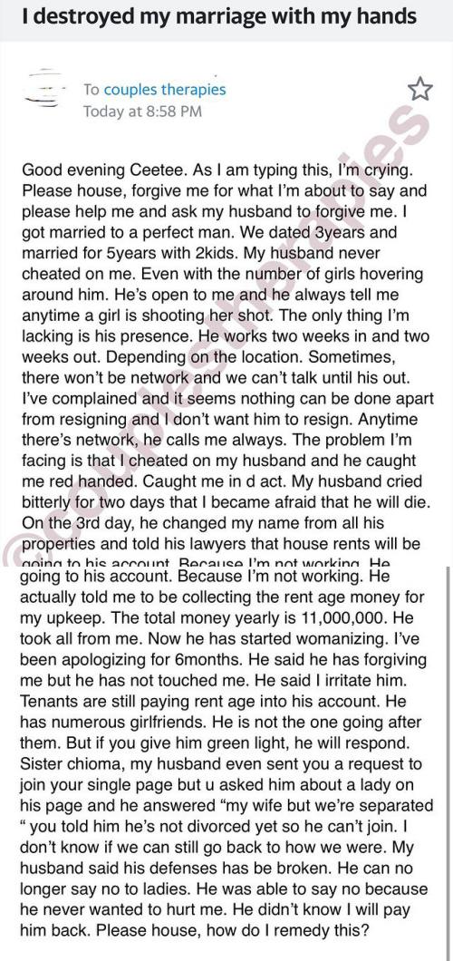 “Good evening Ceetee. As I am typing this, I’m crying. Please house, forgive me for what I’m about to say and please help me and ask my husband to forgive me. I got married to a perfect man. We dated 3years and married for 5years with 2kids.
