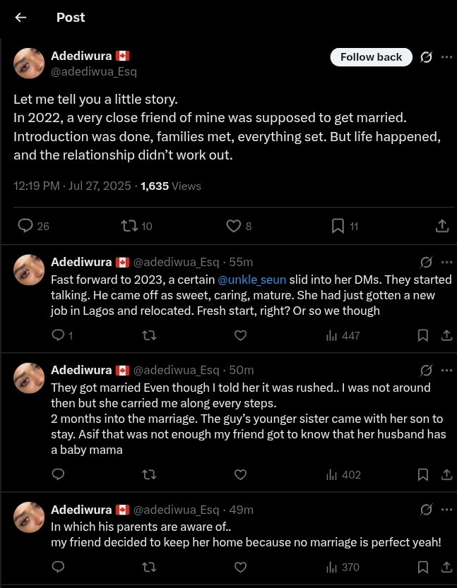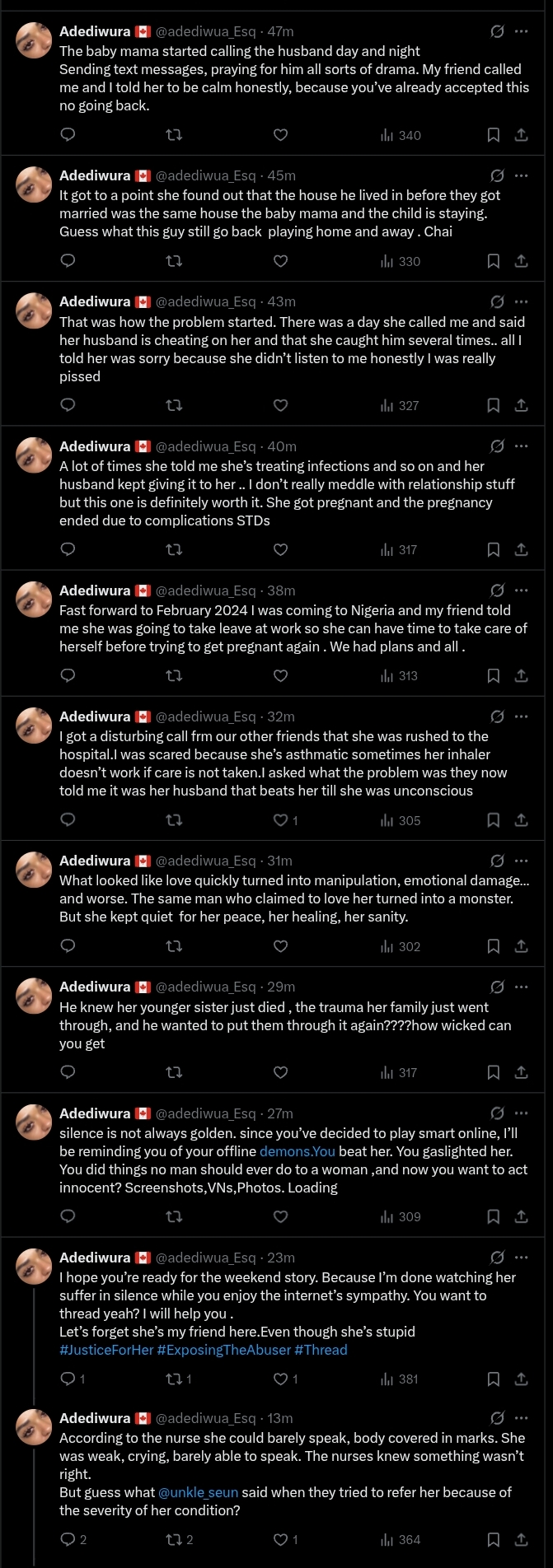 “Fast forward to 2023, a certain @unkle_seun slid into her DMs. They started talking. He came off as sweet, caring, mature. She had just gotten a new job in Lagos and relocated. Fresh start, right? Or so we thought.”