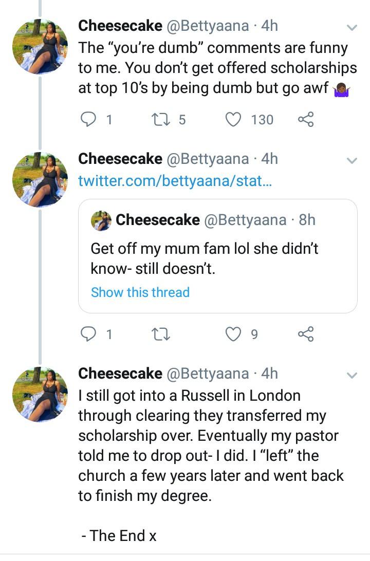 The young lady said she later got into Russell in London through a scholarship but the pastor told her to drop out and she did.
