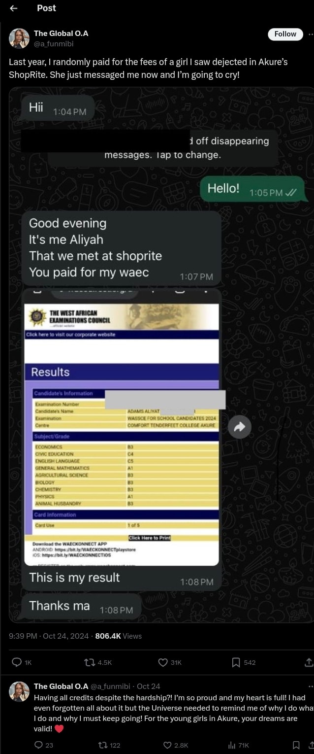A Nigerian woman shared her joy after a young girl she had encountered in 2023 at ShopRite, Akure, and whose WAEC fees she had paid, reached out to show her successful results.