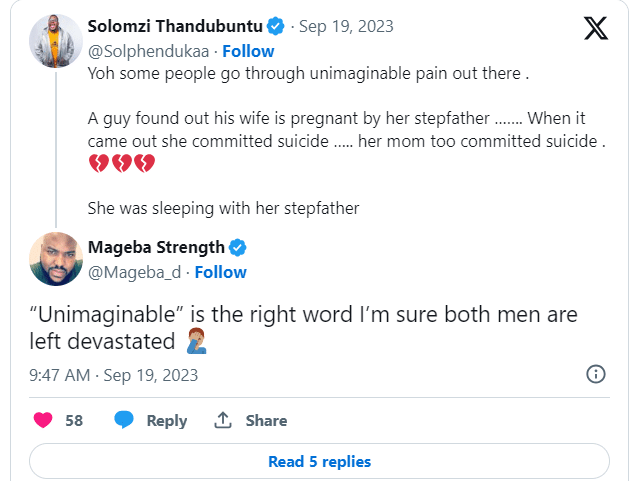 “Yoh some people go through unimaginable pain out there. A guy found out his wife is pregnant by her stepfather. When it came out she komited svicide….. her mom too komited svicide. 💔💔💔 She was sleeping with her stepfather.”