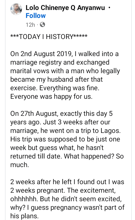 On 27th August, exactly this day 5 years ago. Just 3 weeks after our marriage, he went on a trip to Lagos. His trip was supposed to be just one week but guess what, he hasn’t returned till date. What happened? So much.
