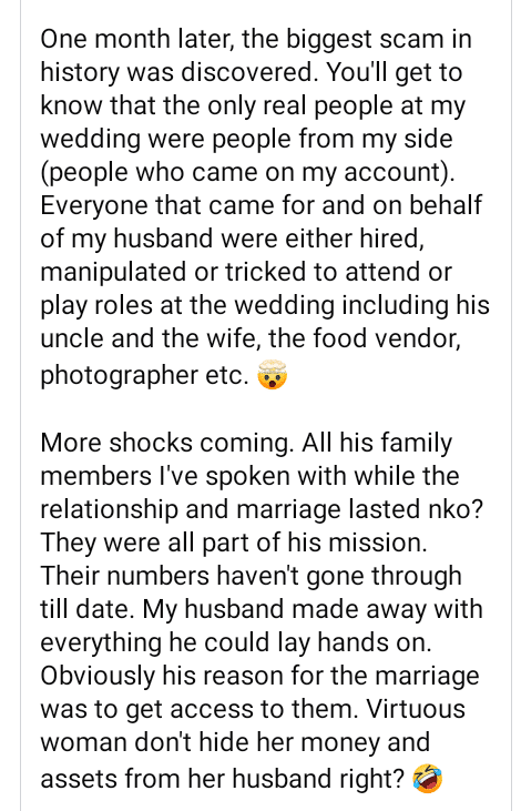 One month later, the biggest scam in history was discovered. You’ll get to know that the only real people at my wedding were people from my side (people who came on my account). Everyone that came for and on behalf of my husband were either hired, manipulated or tricked to attend or play roles at the wedding including his uncle and the wife, the food vendor, photographer etc.