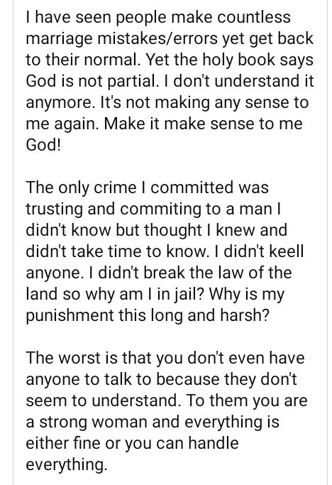 The only crime I committed was trusting and committing to a man I didn’t know but thought I knew and didn’t take time to know. I didn’t keell anyone. I didn’t break the law of the land so why am I in jail? Why is my punishment this long and harsh?